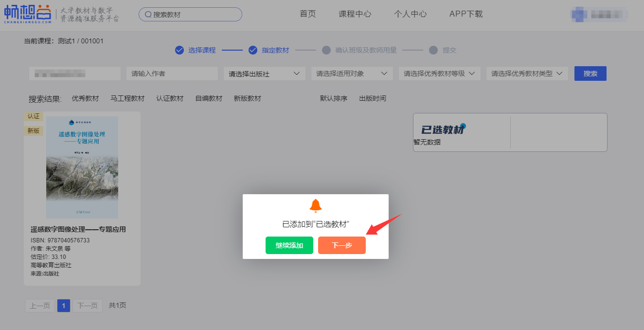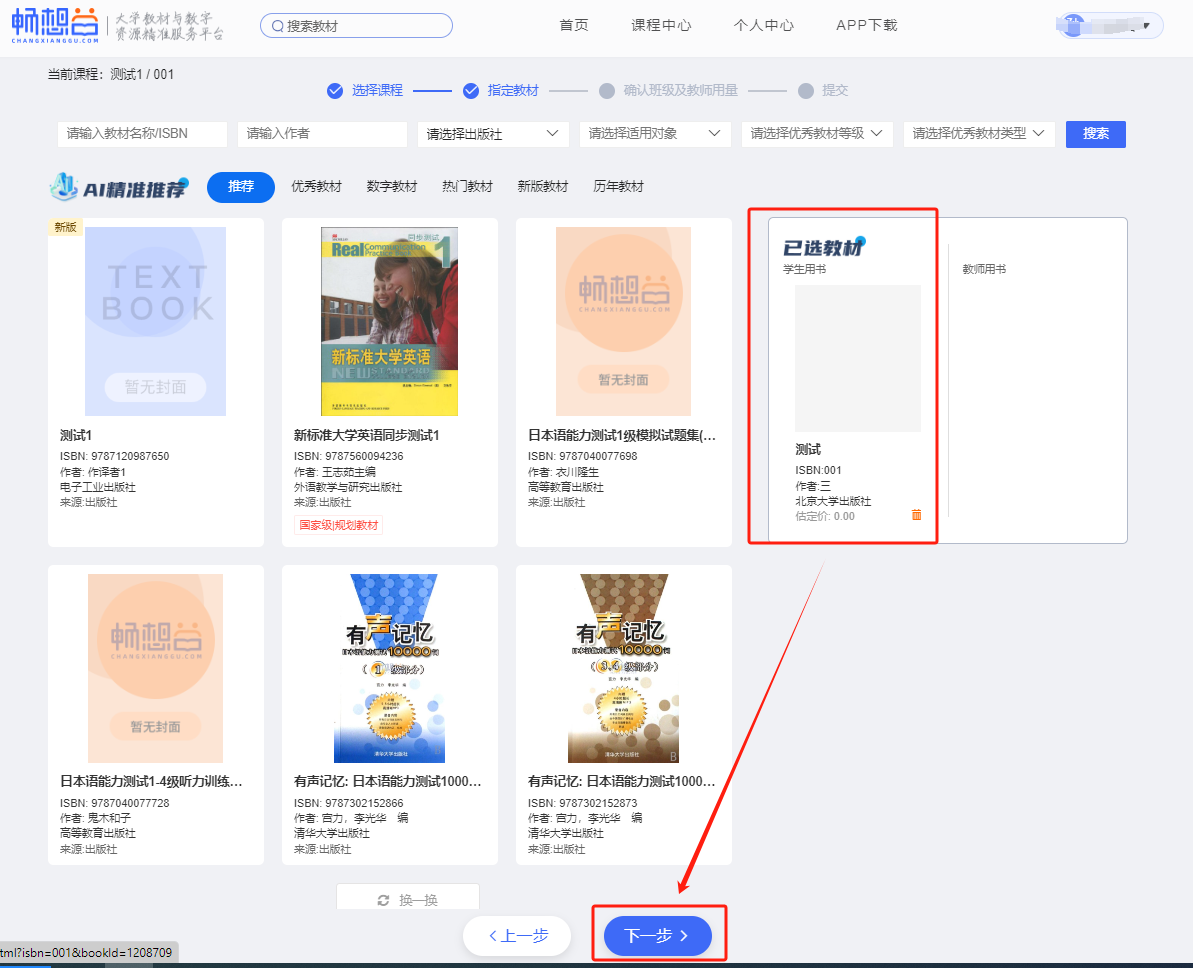 5.选择备选教材,点击“选用”进入下一界面。