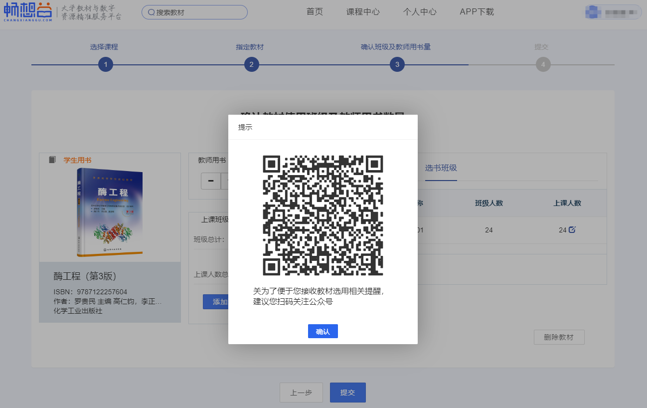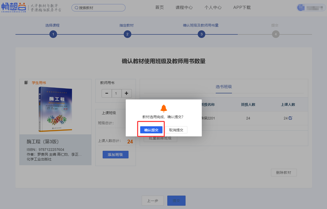 9.核对选用教材、教师用书量、上课班级等信息,准确无误后点击“提交”,若有误请点击“上一步”。