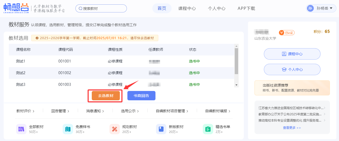 2.进入首页,核对下学期的讲授课程,并点击“去选用教材”,进入教材选用程序。