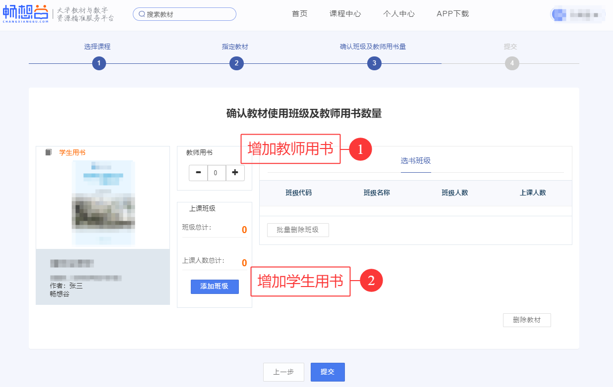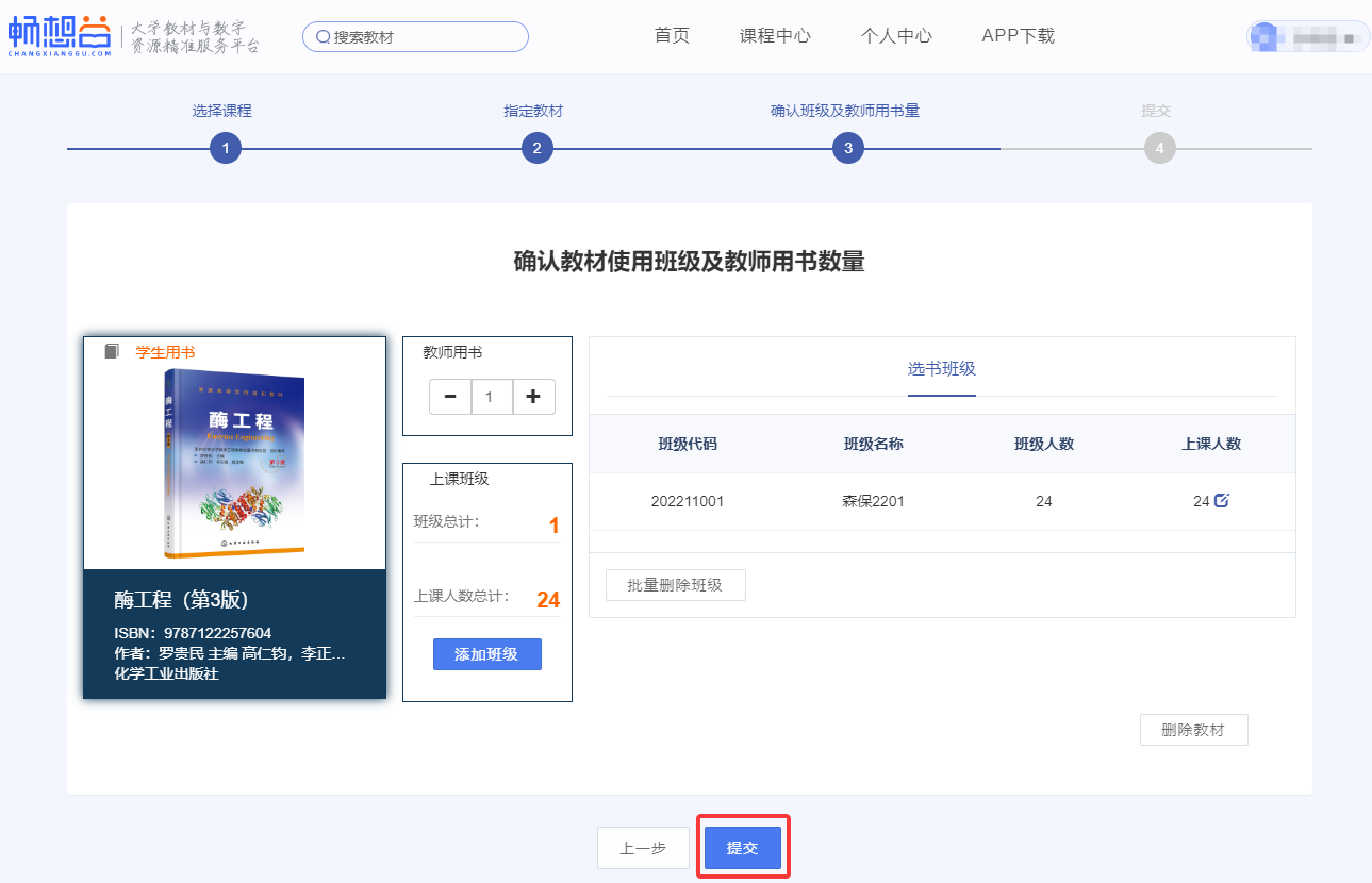 10.核对选用教材、教师用书量、上课班级等信息,准确无误后点击“提交”,若有误请点击“上一步”。