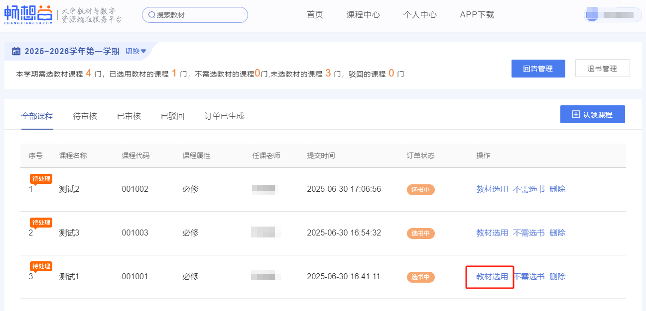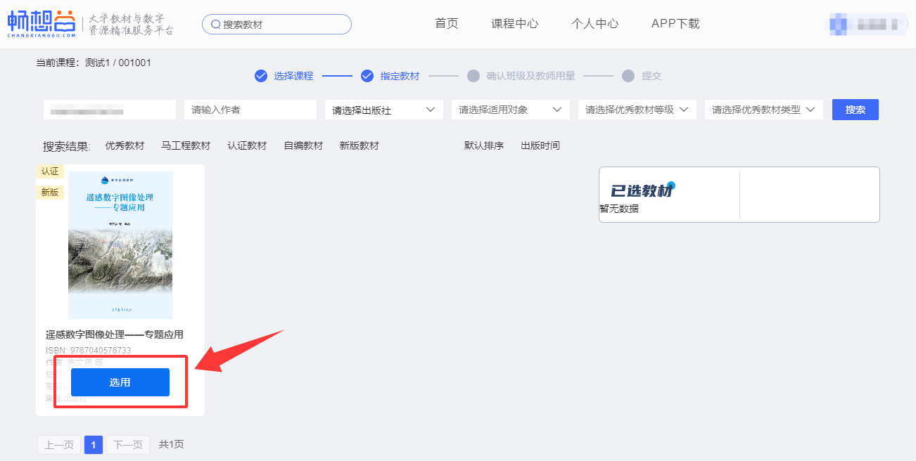3.选择目标课程,并点击“教材选用”,进入选用界面。