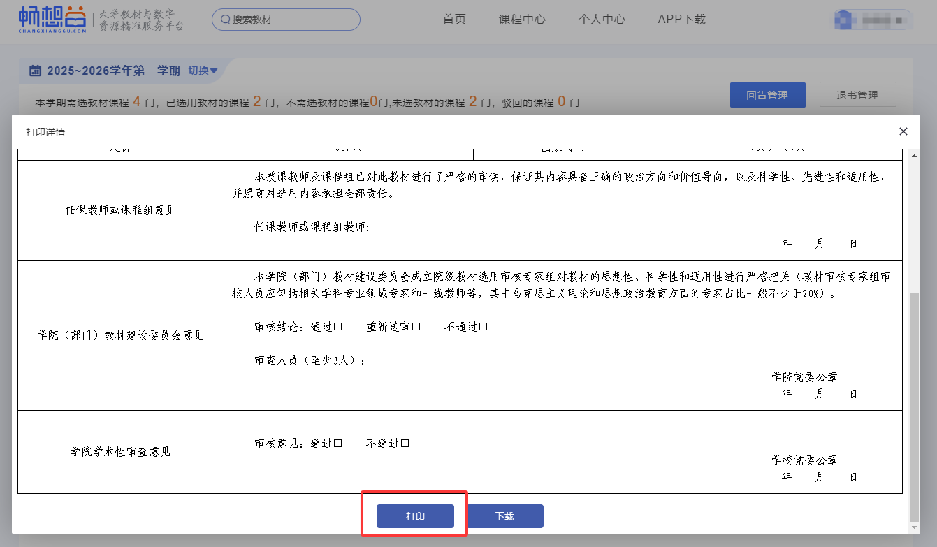 12.点击“打印/下载”,本人签字后,报学院教学秘书,由学院教材建设委员会统一审查后,学院根据审查结论签字盖章。