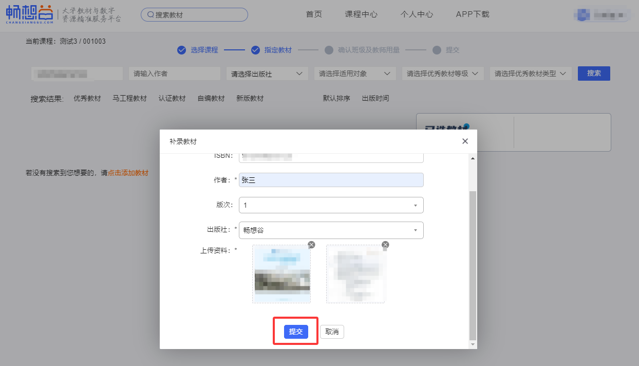 5.依次补录“教材名称”,“作者”,“ISBN”,“出版社”,“版次”等信息,上传教材封面和扉页,格式为PNG,JPG等,点击“提交”。